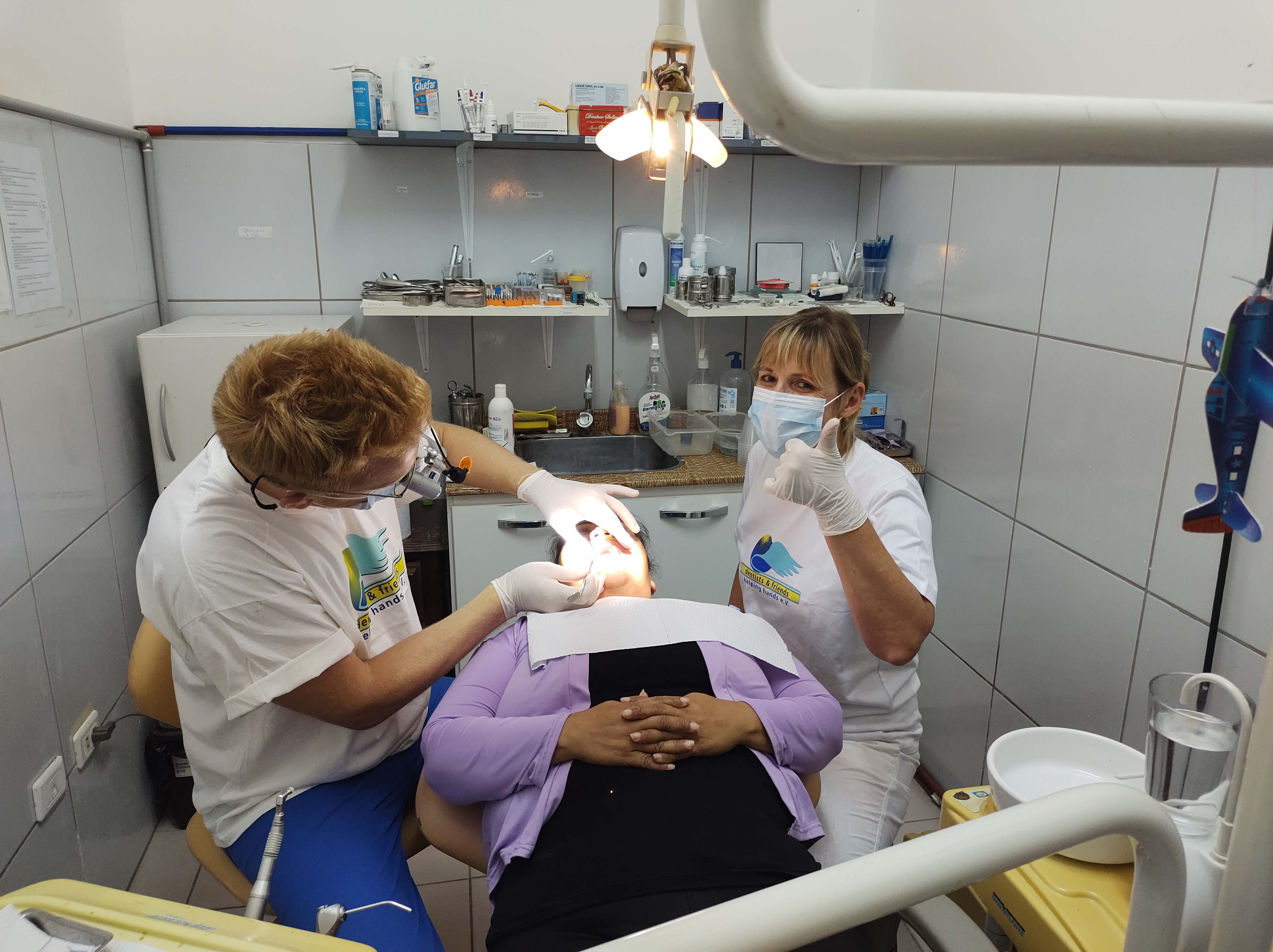 Wir mussten uns rasch an die Hygienestandards vor Ort und die ungewohnte Ausstattung anpassen. Wir führten Zahnreinigungen durch, legten Füllungen und entfernten Zähne bzw. führten Osteotomien durch. Die alte Behandlungseinheit stellte eine Herausforderung dar: Die Dichtungen am Winkelstück bzw. an der Turbine waren undicht, sodass an manchen Tagen der Behandlungsraum unter Wasser stand und die Patient*innen durchnässt herauskamen. Mit Teflonband gelang es uns teilweise, die undichten Stellen zu beheben. Wir informierten Nacira, die sich darum kümmerte, dass die Einheit nach unserem Einsatz in der Plataforma weitgehend repariert wurde.